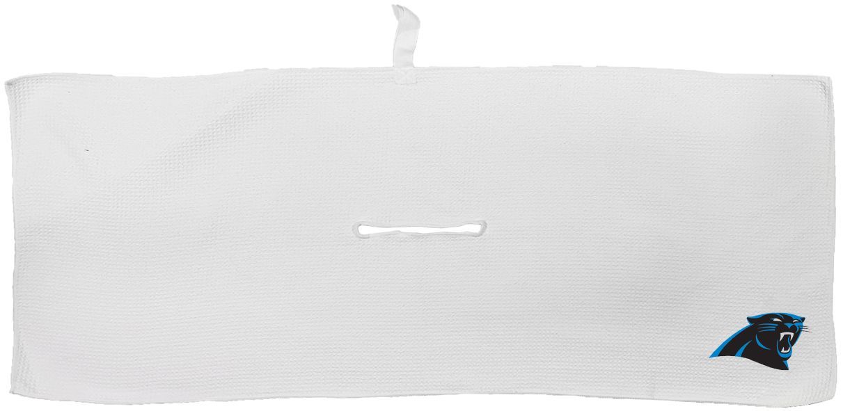 Carolina Panthers Large Microfiber Towel - 16" x 40" (White) Carabiner attachment system, Measures approx. 16'' x 40'', Sublimated graphics, Center slit measures approx. 6" in diameter, Fabric loop, Material: 85% Polyester/15% Polyamide, Machine wash, tumble dry low, Officially licensed
