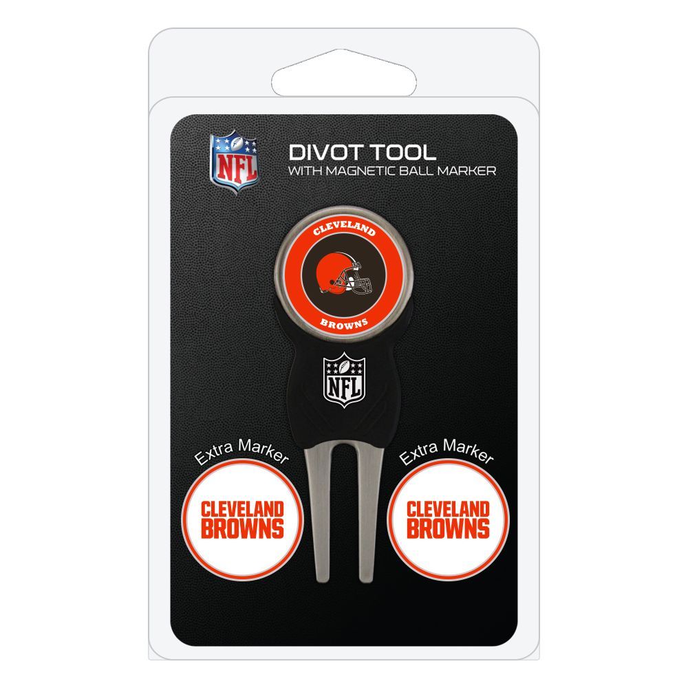 Cleveland Browns Divot Tool Pack - Signature tool w/ 3 markers Add some team pride to your game on the green with the Team Golf? Divot Tool and Marker Set. This set includes three double-sided, enamel magnetic markers that feature the team logo and wordmark and a nickel-finished divot tool with the team logo. The magnetic markers are easily removed from and reattach to the divot tool, making it easy to mark your ball. Support your team with this team-inspired set.
