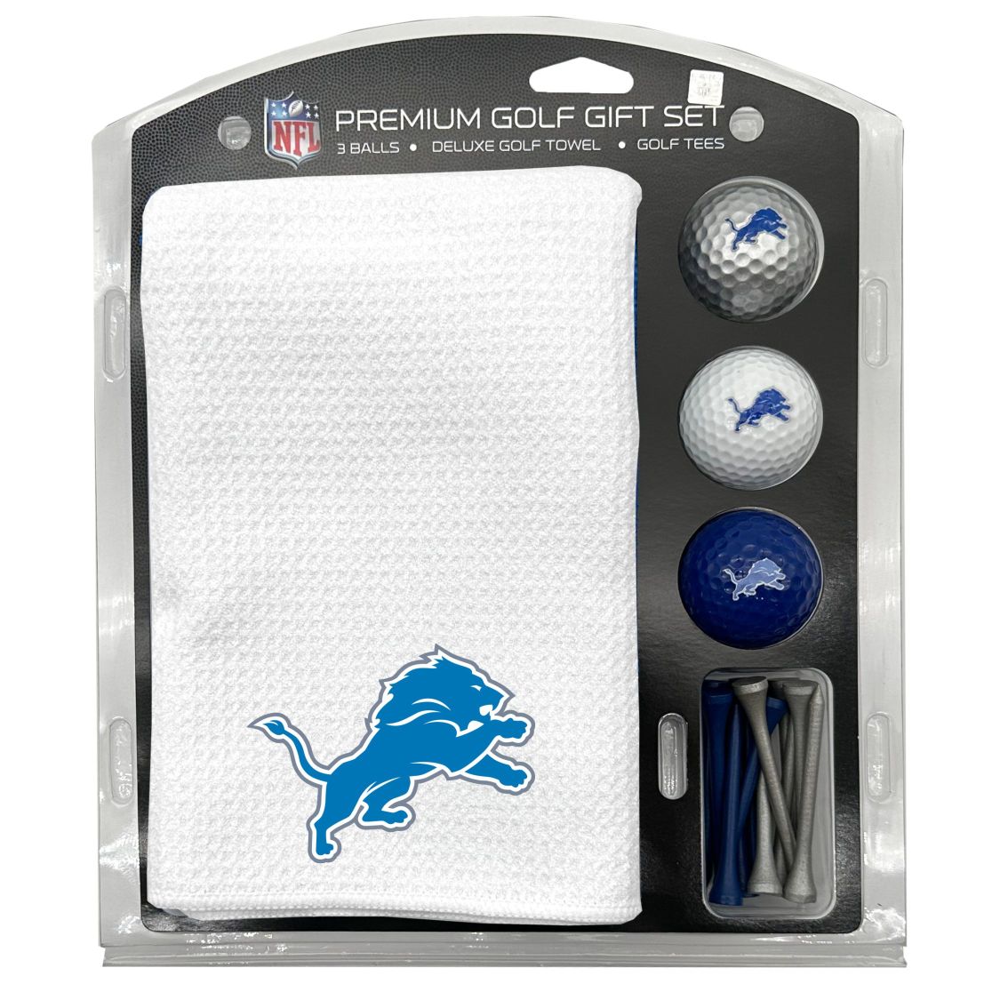 Detroit Lions Microfiber Towel Gift Set - 16 x 40 (White) 16” x 40” printed logo towel, 3 different color golf balls, 12 golf tees, High quality digital print
