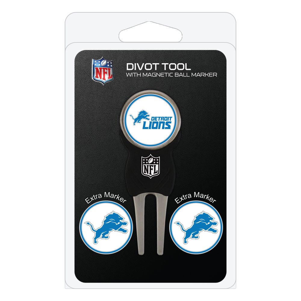 Detroit Lions Divot Tool Pack - Signature tool w/ 3 markers Add some team pride to your game on the green with the Team Golf? Divot Tool and Marker Set. This set includes three double-sided, enamel magnetic markers that feature the team logo and wordmark and a nickel-finished divot tool with the team logo. The magnetic markers are easily removed from and reattach to the divot tool, making it easy to mark your ball. Support your team with this team-inspired set.