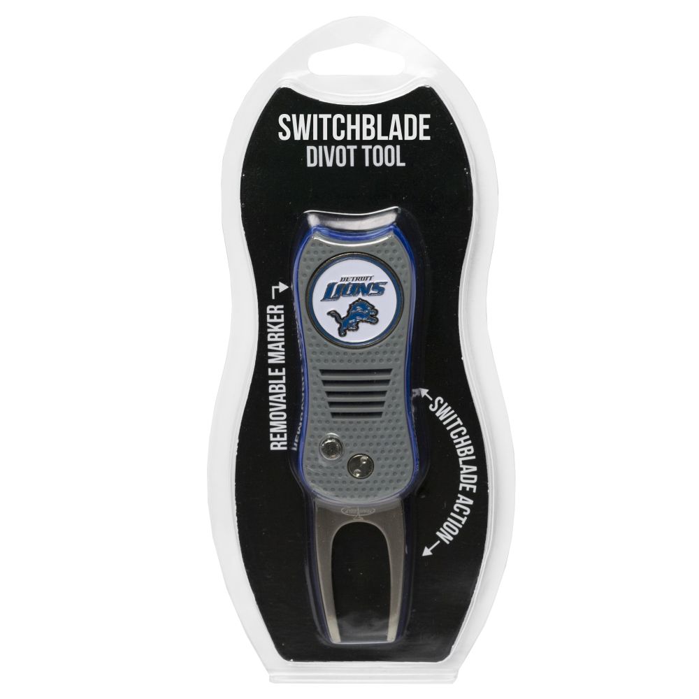 Detroit Lions Switchblade Divot Tool Pack Ball marker measures approx. 1'' in diameter, Divot tool measures approx. 2.8'' in height when closed; 4.5'' when open, Printed graphics with enamel overlay, Soft-touch rubberized grip, Switchblade function with button release, Magnetic ball marker, Material: 100% Plastic - Base; 100% Metal - Divot Tool & Marker