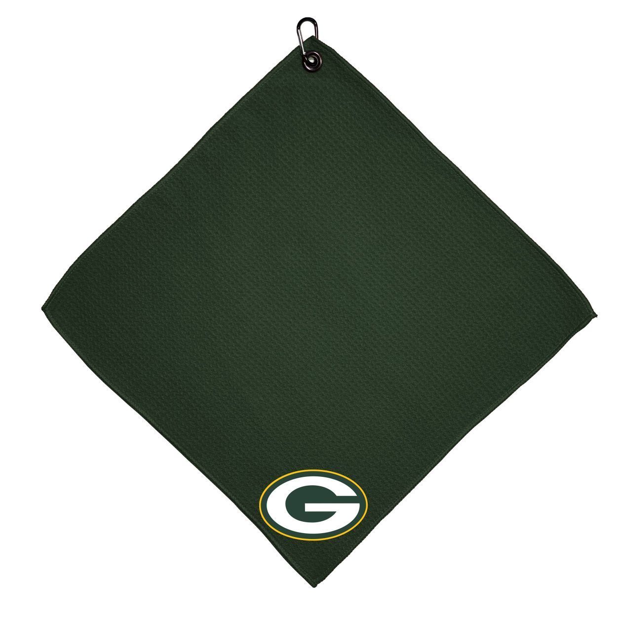 Green Bay Packers Microfiber Towel - 15" x 15" (Colored) Carabiner attached, Measures approx. 15" x 15", Cleans without scratching club surface, Printed graphics, Material: 85% Polyester/15% Polyamide, Woven waffle fabric, Machine wash, tumble dry low, Officially licensed