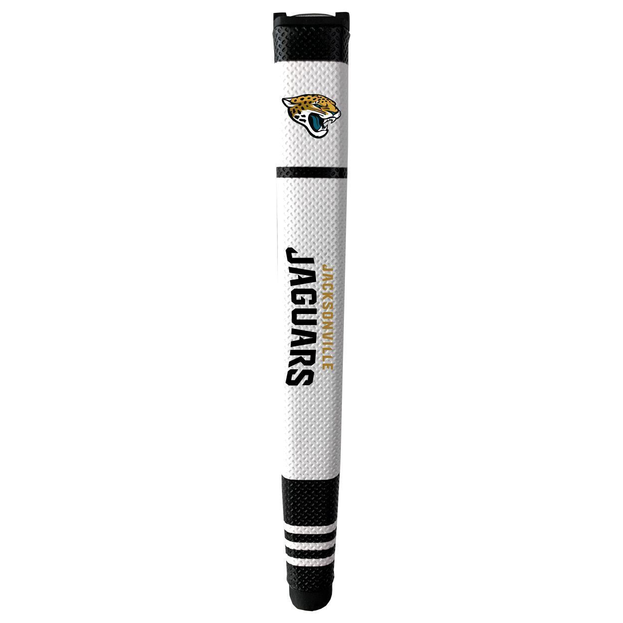 Jacksonville Jaguars Putter Grip (White with colored stripes) Durable rubber construction, Measures approx. 12.5" x 3.5" x 2", Printed graphics, Soft polyurethane surface, Includes removable ball marker, Debossed design, Material: 85% Rubber/15% PVC