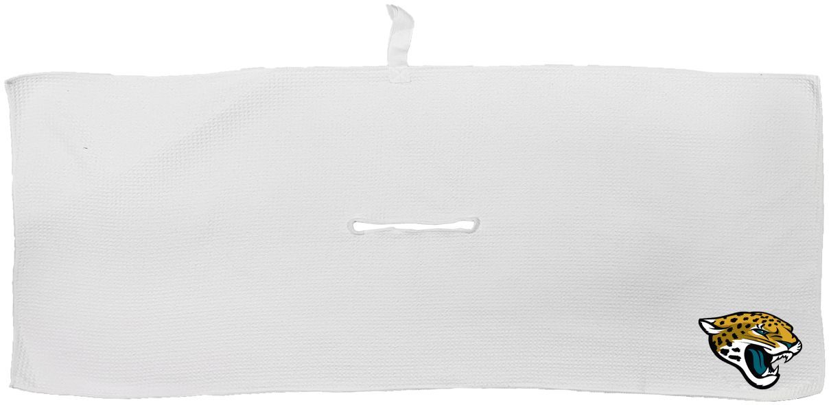 Jacksonville Jaguars Large Microfiber Towel - 16" x 40" (White) Carabiner attachment system, Measures approx. 16'' x 40'', Sublimated graphics, Center slit measures approx. 6" in diameter, Fabric loop, Material: 85% Polyester/15% Polyamide, Machine wash, tumble dry low, Officially licensed
