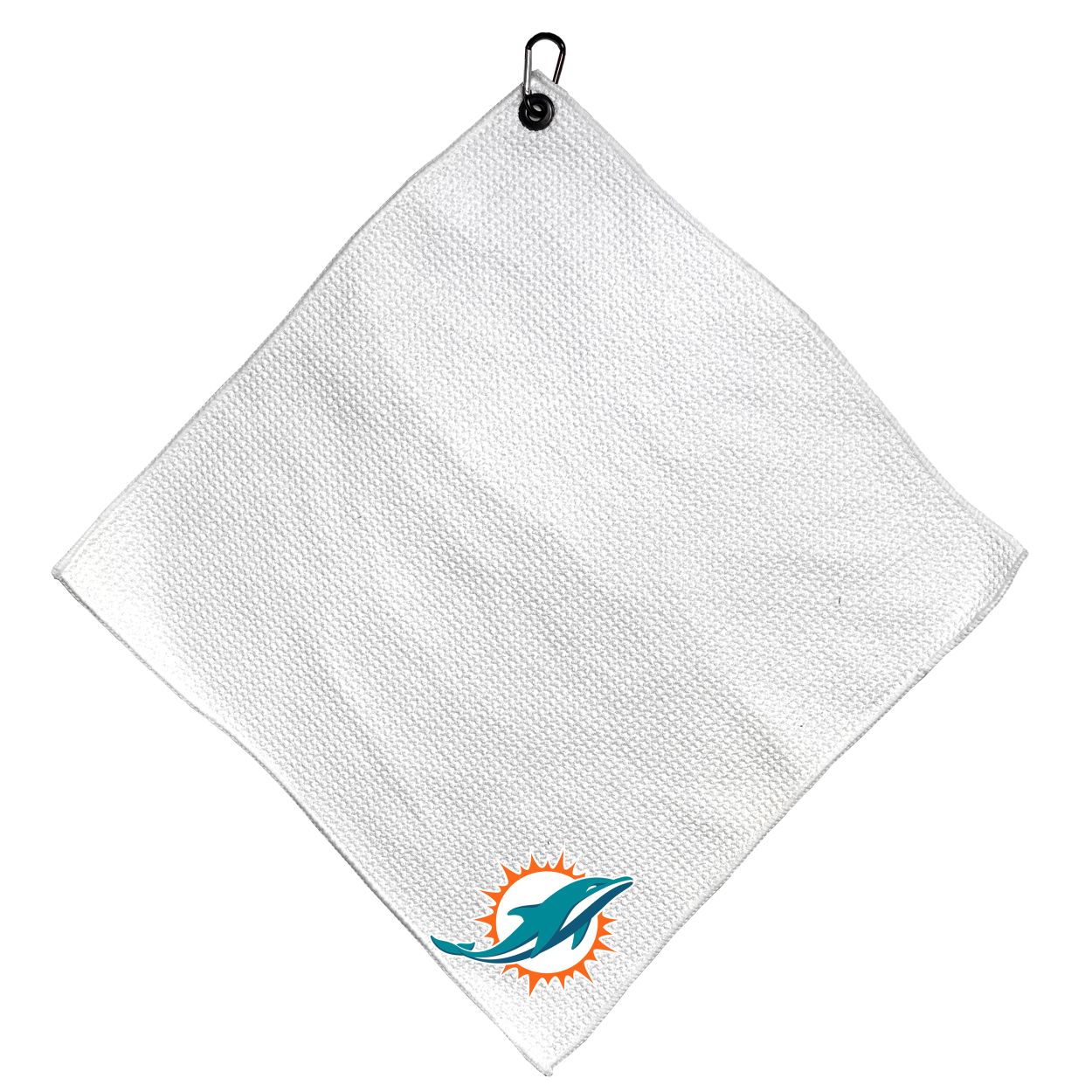 Miami Dolphins Microfiber Small Towel - 15" x 15" (White) Carabiner attached, Measures approx. 15" x 15", Cleans without scratching club surface, Printed graphics, Material: 85% Polyester/15% Polyamide, Woven waffle fabric, Machine wash, tumble dry low, Officially licensed