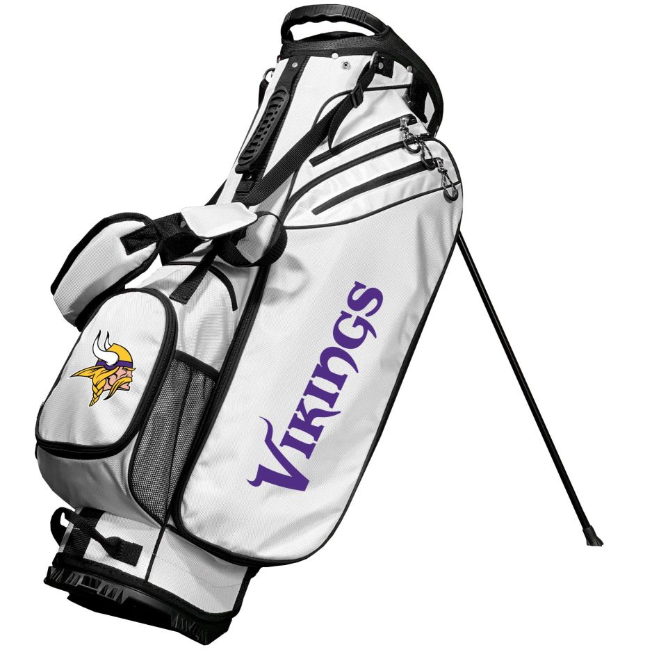 Minnesota Vikings Birdie Golf Stand Bag - White 4-way full length dividers, Two lift assist handles, Six Zippered pockets, Cooler pocket, Padded shoulder strap, Screen print graphics, Fleece-lined valuables pouch, Integrated top handle, Measures approximately 36" x 15" x , Towel ring, Umbrella holder, Kick stand, Glove holder, Material: 60% Nylon/40% Plasti, Officially licensed