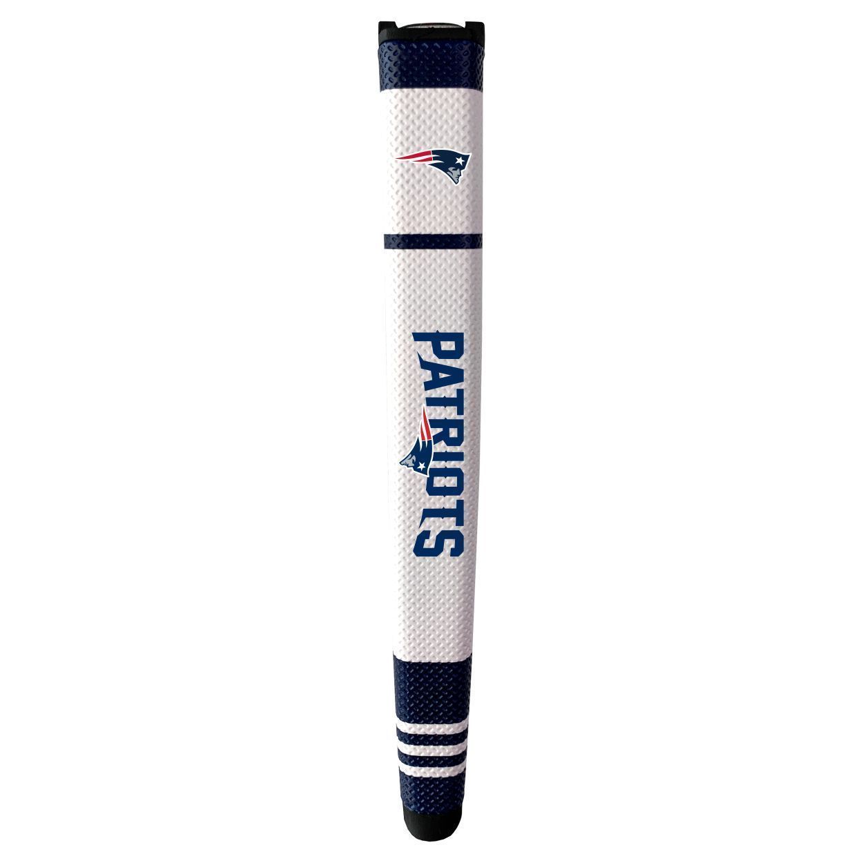 New England Patriots Putter Grip (White with colored stripes) Durable rubber construction, Measures approx. 12.5" x 3.5" x 2", Printed graphics, Soft polyurethane surface, Includes removable ball marker, Debossed design, Material: 85% Rubber/15% PVC