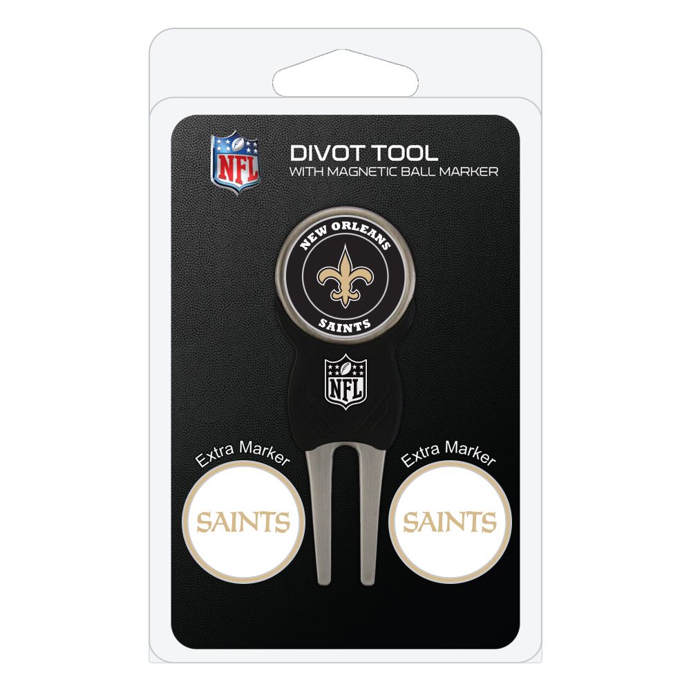 New Orleans Saints Divot Tool Pack - Signature tool w/ 3 markers Add some team pride to your game on the green with the Team Golf? Divot Tool and Marker Set. This set includes three double-sided, enamel magnetic markers that feature the team logo and wordmark and a nickel-finished divot tool with the team logo. The magnetic markers are easily removed from and reattach to the divot tool, making it easy to mark your ball. Support your team with this team-inspired set.