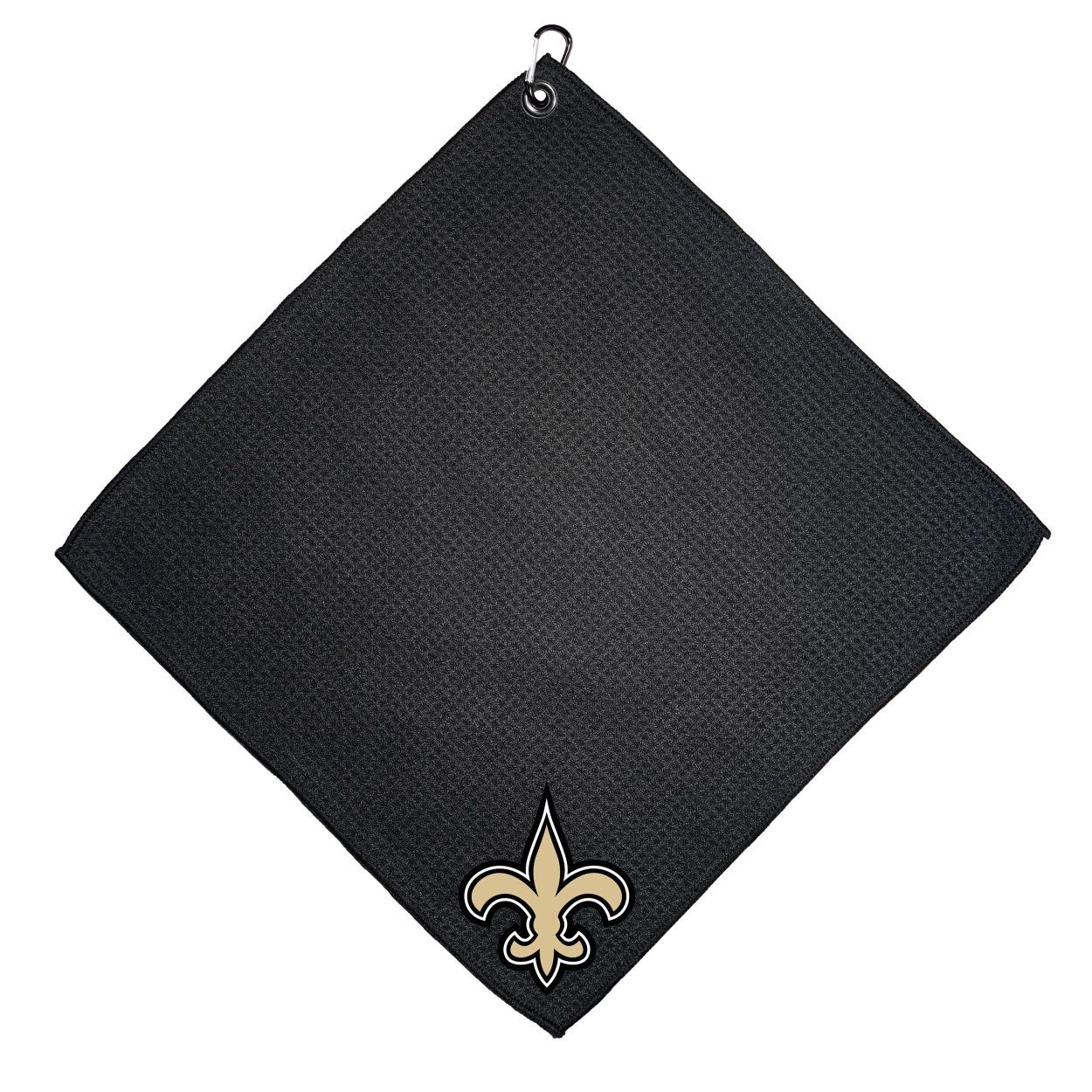 New Orleans Saints Microfiber Towel - 15" x 15" (Colored) Carabiner attached, Measures approx. 15" x 15", Cleans without scratching club surface, Printed graphics, Material: 85% Polyester/15% Polyamide, Woven waffle fabric, Machine wash, tumble dry low, Officially licensed