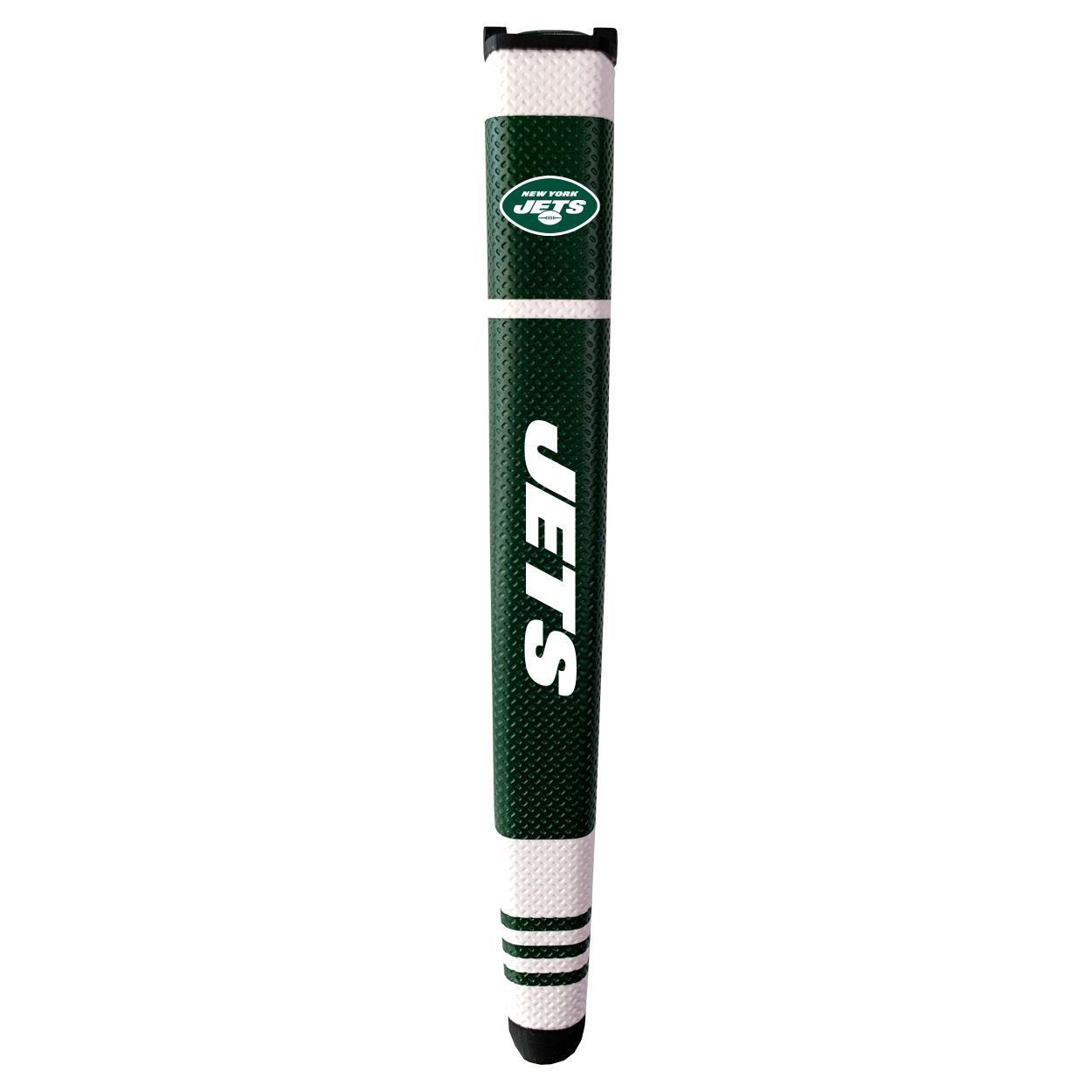 New York Jets Putter Grip (Colored with white stripes) Durable rubber construction, Measures approx. 12.5" x 3.5" x 2", Printed graphics, Soft polyurethane surface, Includes removable ball marker, Debossed design, Material: 85% Rubber/15% PVC