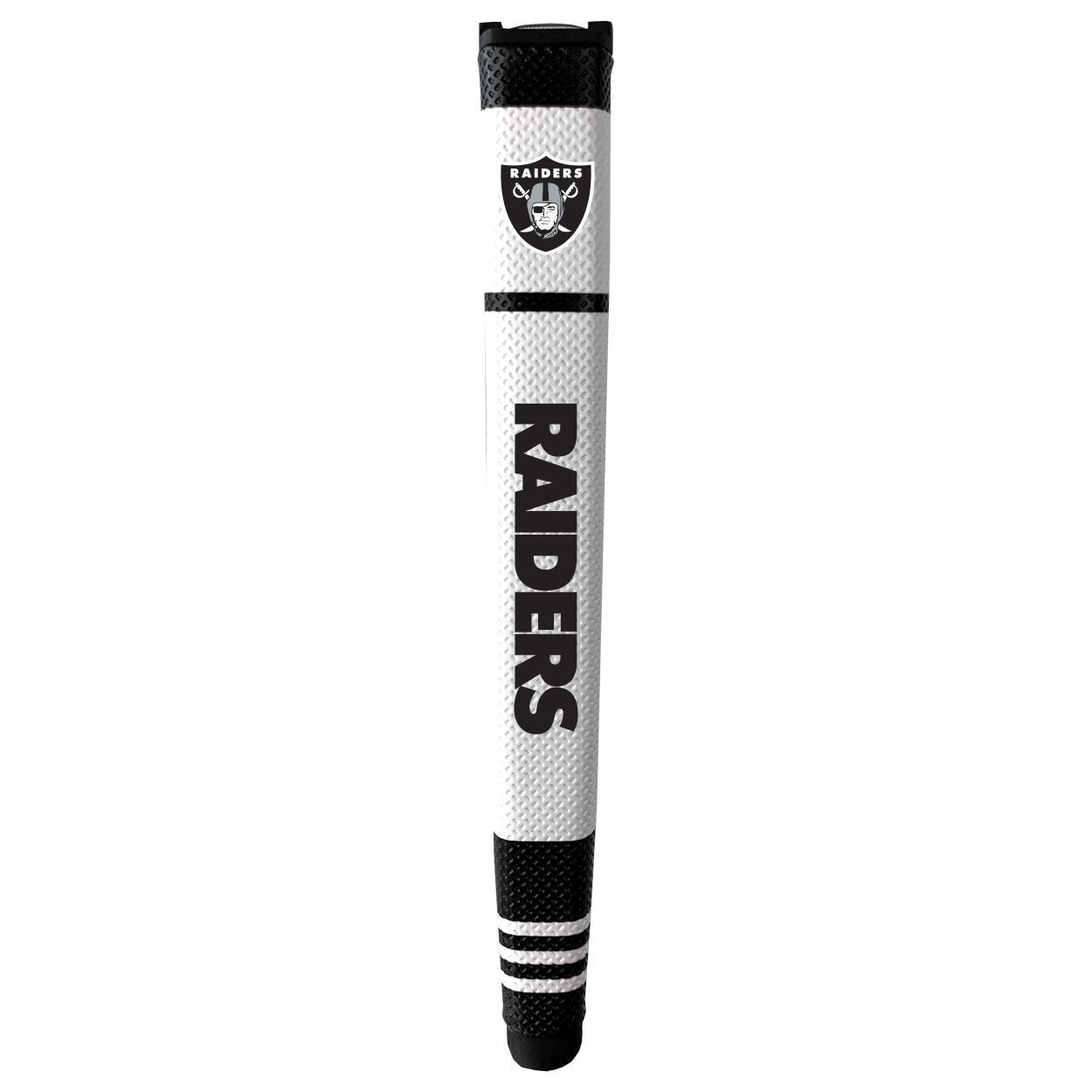 Las Vegas Raiders Putter Grip (White with colored stripes) Durable rubber construction, Measures approx. 12.5" x 3.5" x 2", Printed graphics, Soft polyurethane surface, Includes removable ball marker, Debossed design, Material: 85% Rubber/15% PVC