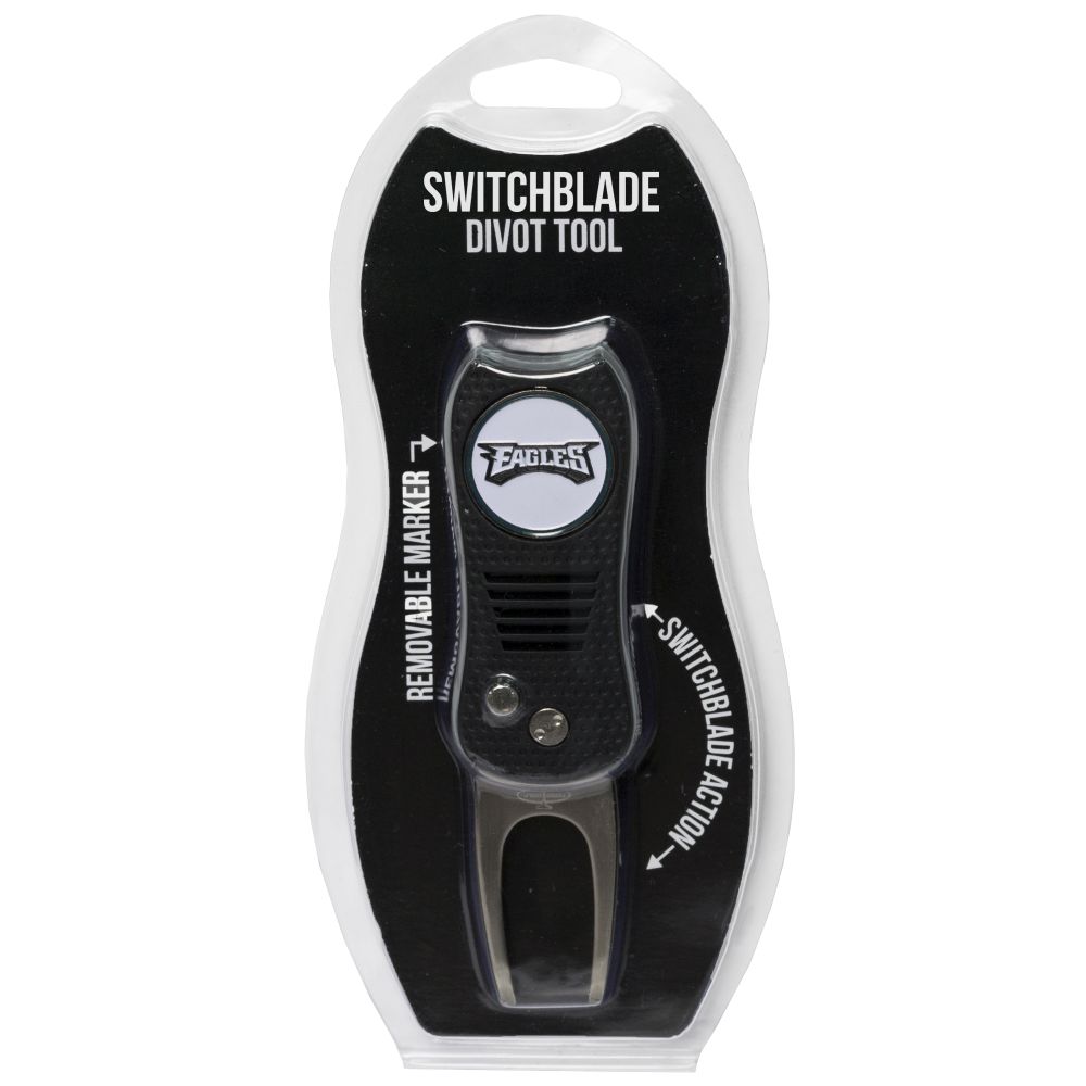Philadelphia Eagles Switchblade Divot Tool Pack Ball marker measures approx. 1'' in diameter, Divot tool measures approx. 2.8'' in height when closed; 4.5'' when open, Printed graphics with enamel overlay, Soft-touch rubberized grip, Switchblade function with button release, Magnetic ball marker, Material: 100% Plastic - Base; 100% Metal - Divot Tool & Marker