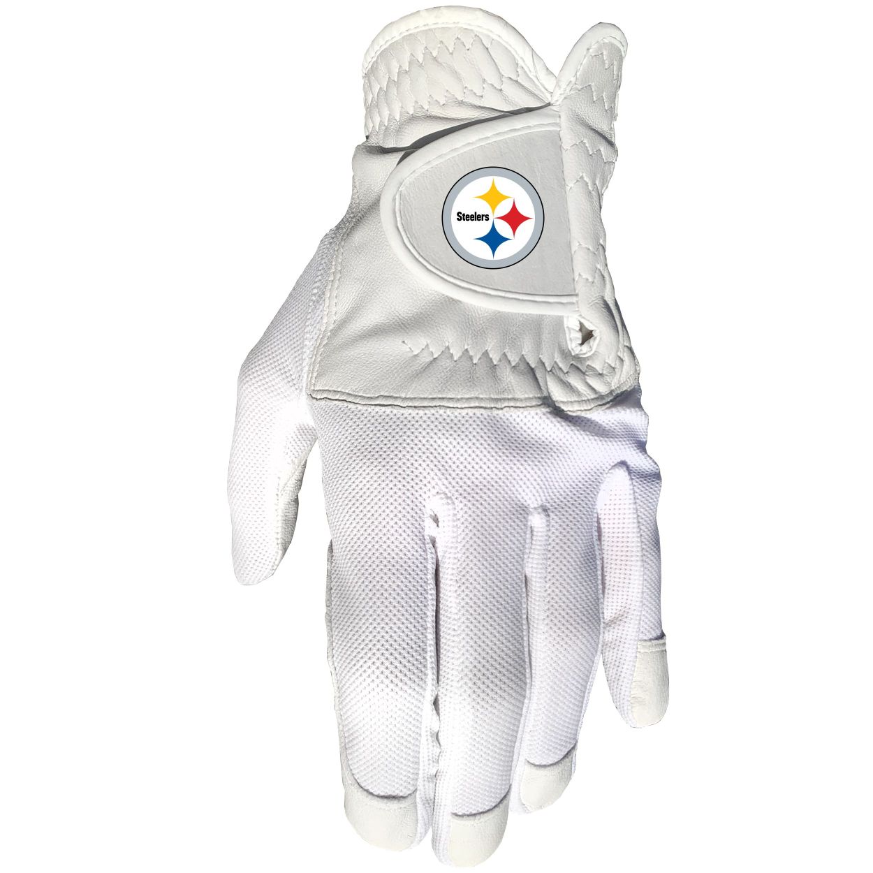 Pittsburgh Steelers Cool mesh with cabretta leather - one size - mens left 100% cabretta leather palm and finger tips, High quality digital print, Fits most hand sizes, Left hand only (for right handed golfers), Great gift for the golfer in your life!