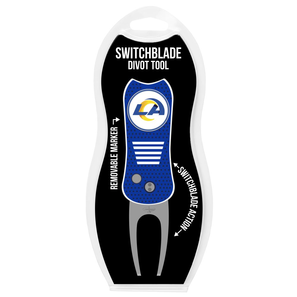 Los Angeles Rams Switchblade Divot Tool Pack Ball marker measures approx. 1'' in diameter, Divot tool measures approx. 2.8'' in height when closed; 4.5'' when open, Printed graphics with enamel overlay, Soft-touch rubberized grip, Switchblade function with button release, Magnetic ball marker, Material: 100% Plastic - Base; 100% Metal - Divot Tool & Marker
