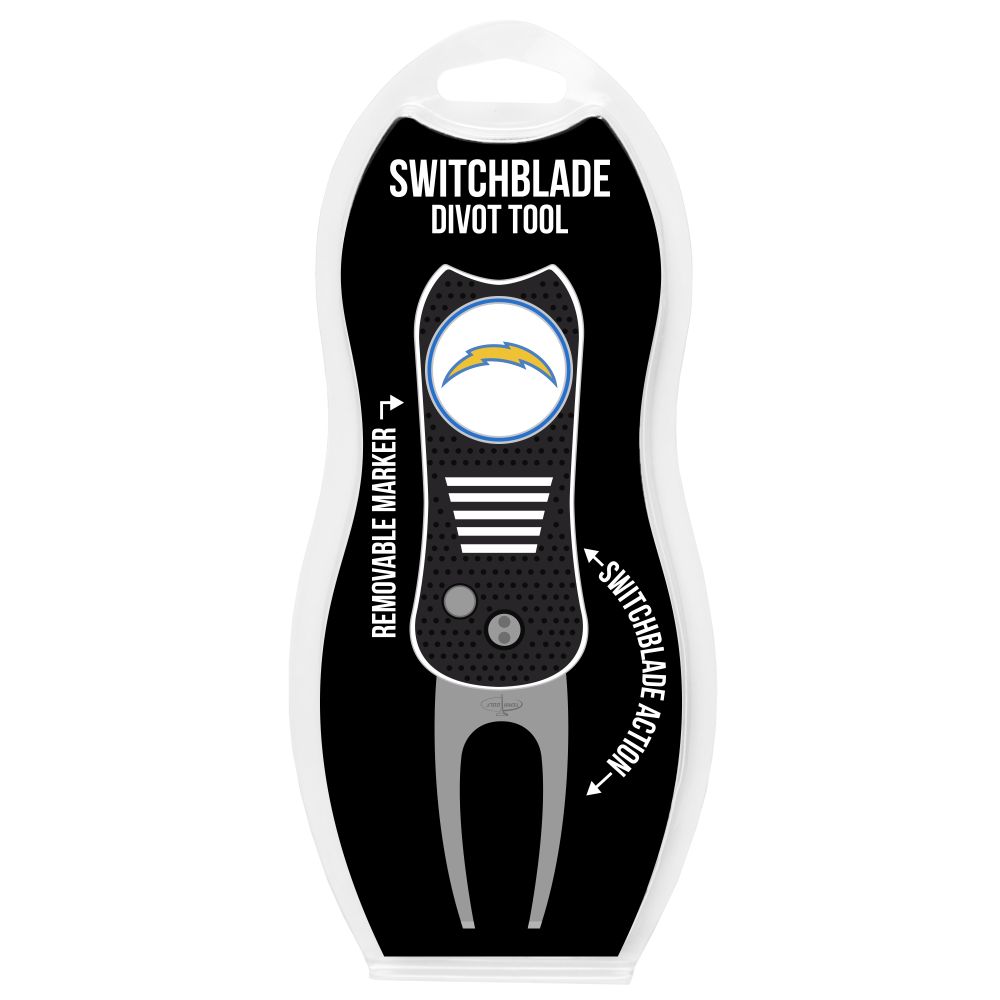 Los Angeles Chargers Switchblade Divot Tool Pack Ball marker measures approx. 1'' in diameter, Divot tool measures approx. 2.8'' in height when closed; 4.5'' when open, Printed graphics with enamel overlay, Soft-touch rubberized grip, Switchblade function with button release, Magnetic ball marker, Material: 100% Plastic - Base; 100% Metal - Divot Tool & Marker