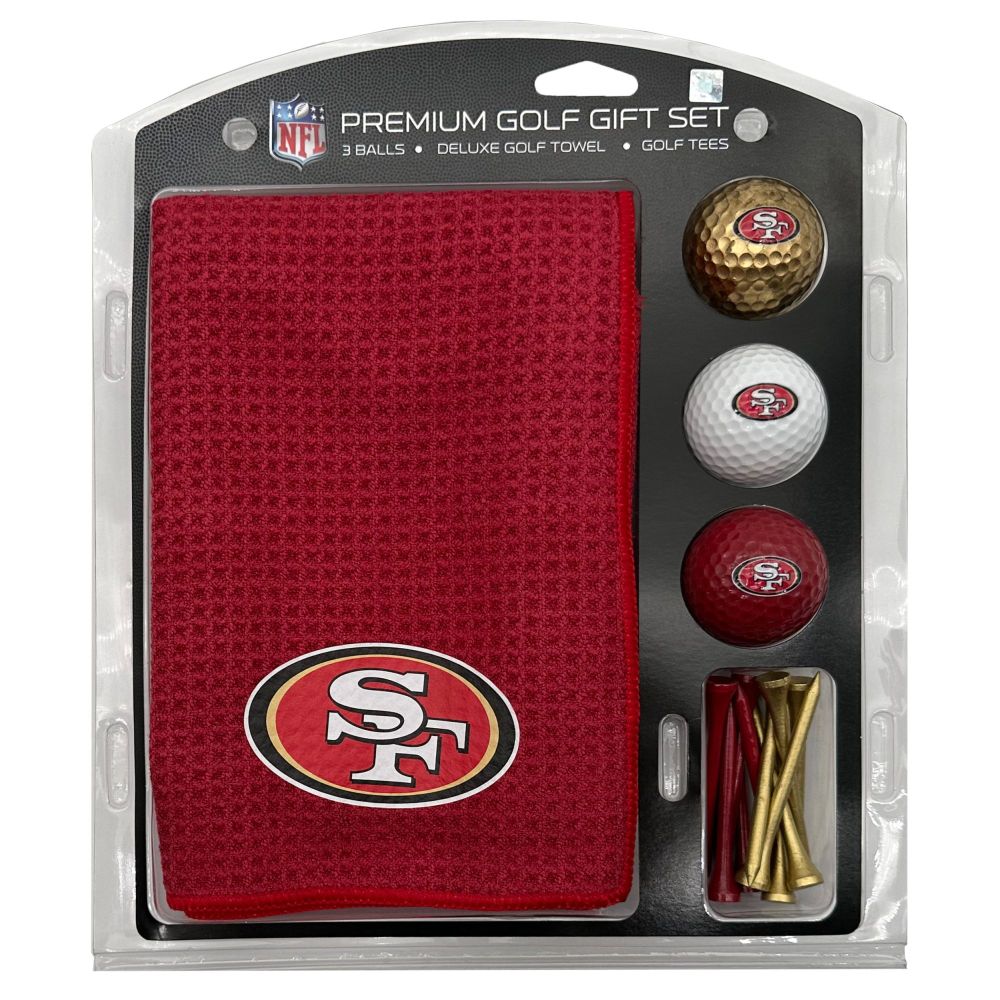 San Francisco 49ers Microfiber Towel Gift Set - 16 x 40 (Colored) 16” x 40” printed logo towel, 3 different color golf balls, 12 golf tees, High quality digital print