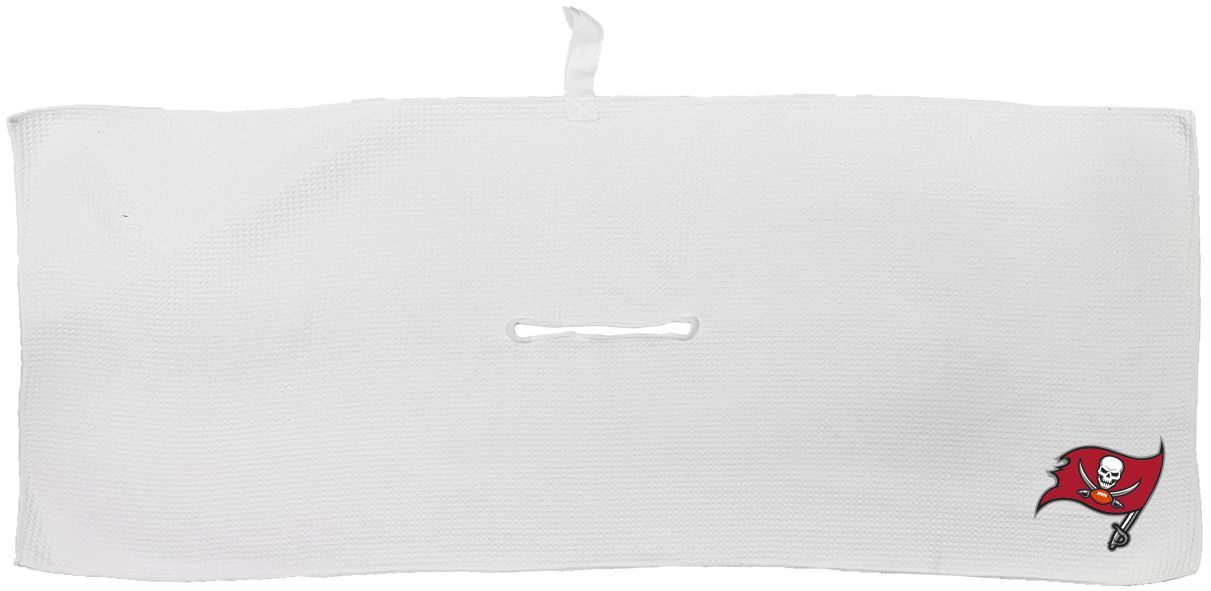 Tampa Bay Buccaneers Large Microfiber Towel - 16" x 40" (White) Carabiner attachment system, Measures approx. 16'' x 40'', Sublimated graphics, Center slit measures approx. 6" in diameter, Fabric loop, Material: 85% Polyester/15% Polyamide, Machine wash, tumble dry low, Officially licensed
