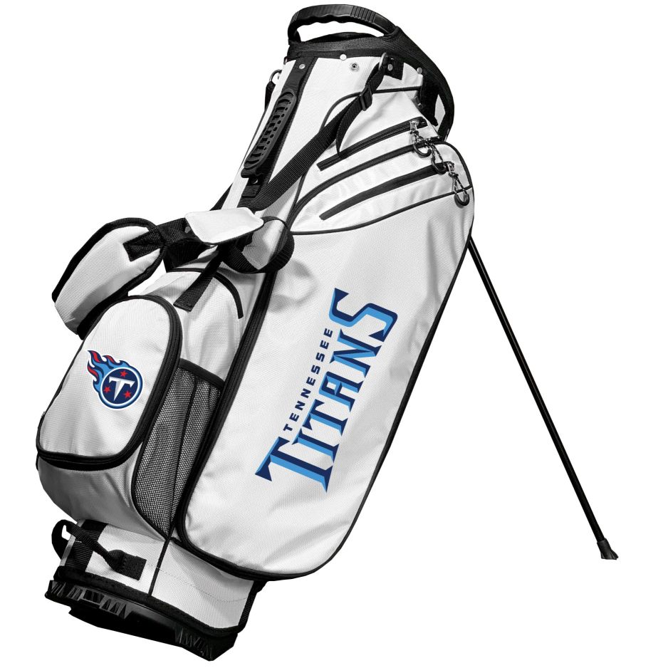 Tennessee Titans Birdie Golf Stand Bag - White 4-way full length dividers, Two lift assist handles, Six Zippered pockets, Cooler pocket, Padded shoulder strap, Screen print graphics, Fleece-lined valuables pouch, Integrated top handle, Measures approximately 36" x 15" x , Towel ring, Umbrella holder, Kick stand, Glove holder, Material: 60% Nylon/40% Plasti, Officially licensed