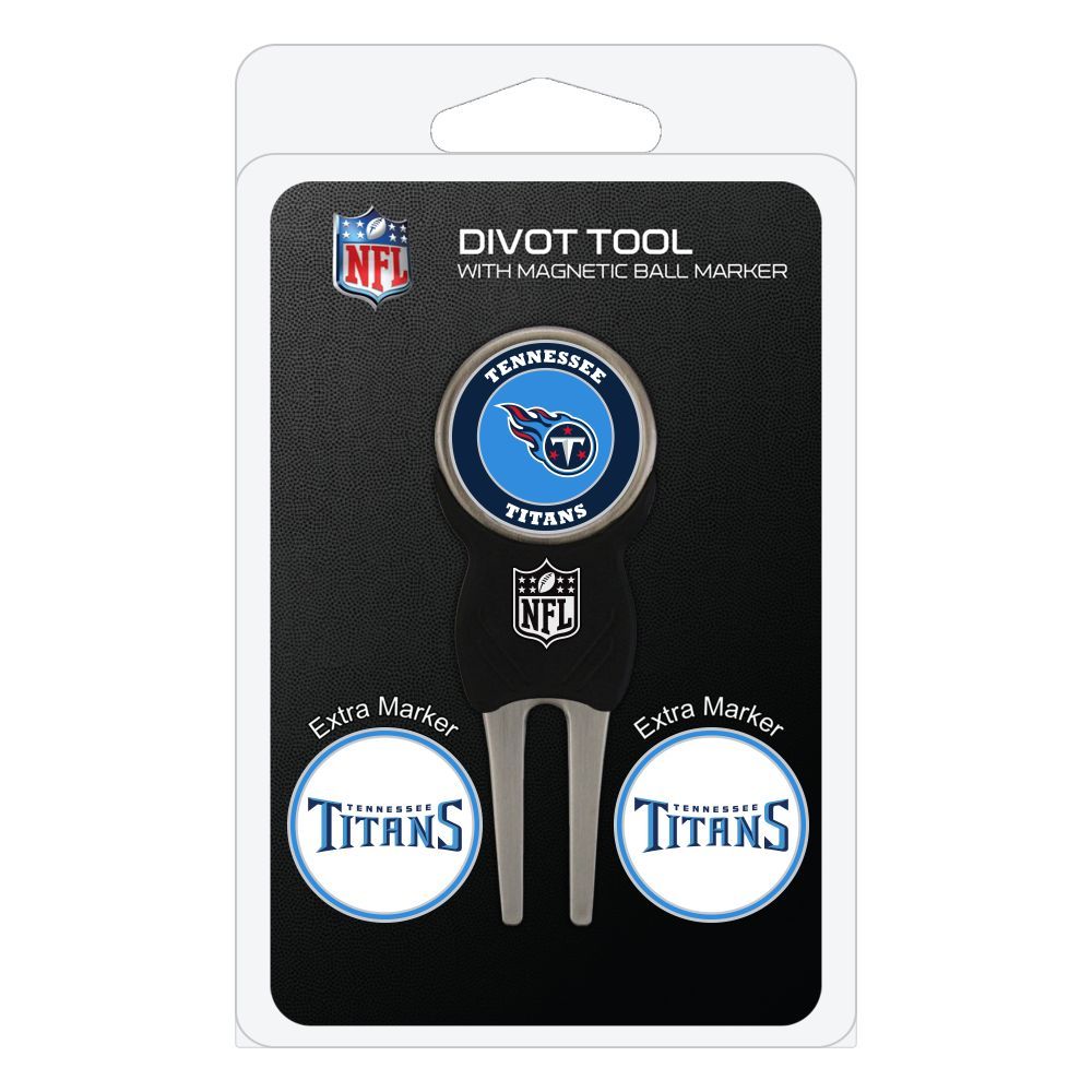 Tennessee Titans Divot Tool Pack - Signature tool w/ 3 markers Add some team pride to your game on the green with the Team Golf? Divot Tool and Marker Set. This set includes three double-sided, enamel magnetic markers that feature the team logo and wordmark and a nickel-finished divot tool with the team logo. The magnetic markers are easily removed from and reattach to the divot tool, making it easy to mark your ball. Support your team with this team-inspired set.