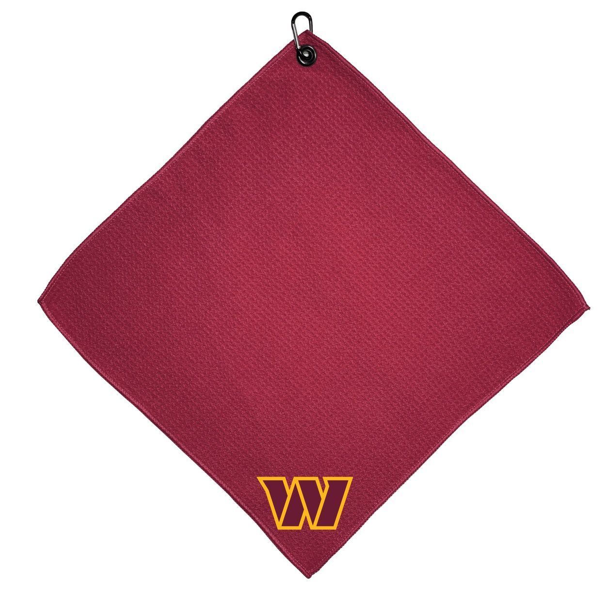 Washington Commanders Microfiber Towel - 15" x 15" (Colored) Carabiner attached, Measures approx. 15" x 15", Cleans without scratching club surface, Printed graphics, Material: 85% Polyester/15% Polyamide, Woven waffle fabric, Machine wash, tumble dry low, Officially licensed