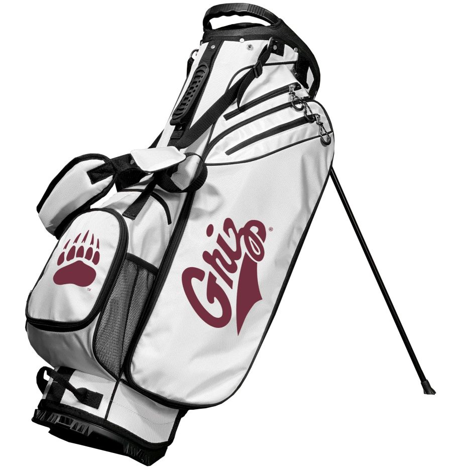 Montana Grizzlies Birdie Golf Stand Bag - White 4-way full length dividers, Two lift assist handles, Six Zippered pockets, Cooler pocket, Padded shoulder strap, Screen print graphics, Fleece-lined valuables pouch, Integrated top handle, Measures approximately 36" x 15" x , Towel ring, Umbrella holder, Kick stand, Glove holder, Material: 60% Nylon/40% Plasti, Officially licensed