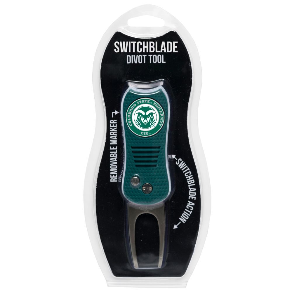 Colorado State Rams Switchblade Divot Tool Pack Ball marker measures approx. 1'' in diameter, Divot tool measures approx. 2.8'' in height when closed; 4.5'' when open, Printed graphics with enamel overlay, Soft-touch rubberized grip, Switchblade function with button release, Magnetic ball marker, Material: 100% Plastic - Base; 100% Metal - Divot Tool & Marker