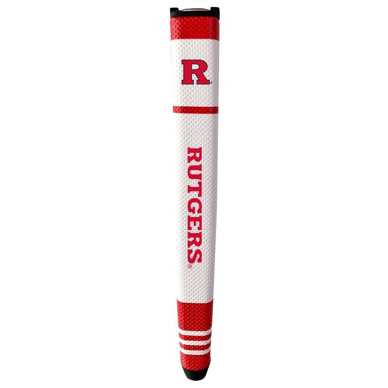 Rutgers Scarlet Knights Putter Grip (White with colored stripes) Durable rubber construction, Measures approx. 12.5" x 3.5" x 2", Printed graphics, Soft polyurethane surface, Includes removable ball marker, Debossed design, Material: 85% Rubber/15% PVC