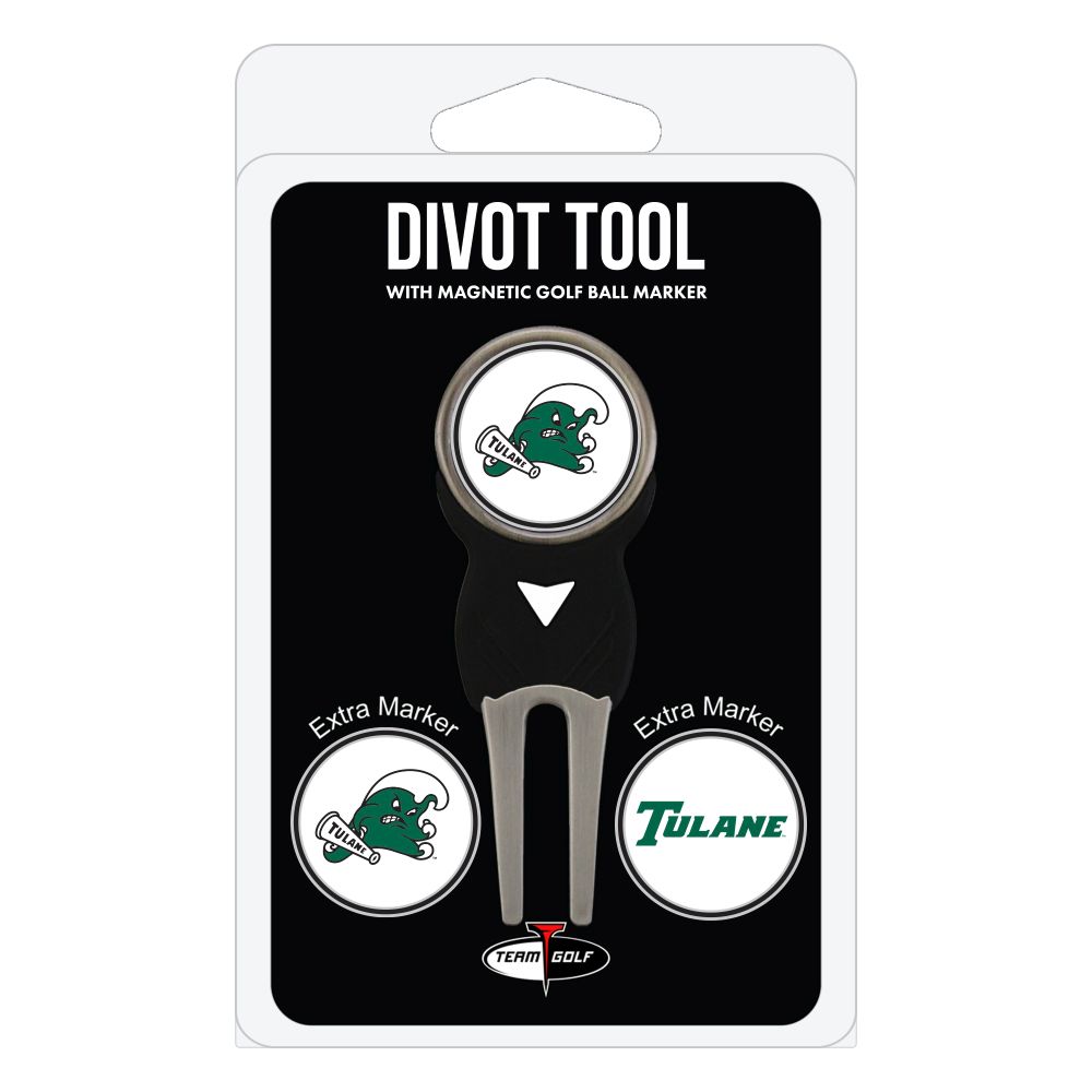 Tulane Green Wave Divot Tool Pack - Signature tool w/ 3 markers Add some team pride to your game on the green with the Team Golf? Divot Tool and Marker Set. This set includes three double-sided, enamel magnetic markers that feature the team logo and wordmark and a nickel-finished divot tool with the team logo. The magnetic markers are easily removed from and reattach to the divot tool, making it easy to mark your ball. Support your team with this team-inspired set.