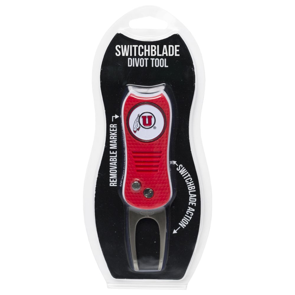 Utah Utes Switchblade Divot Tool Pack Ball marker measures approx. 1'' in diameter, Divot tool measures approx. 2.8'' in height when closed; 4.5'' when open, Printed graphics with enamel overlay, Soft-touch rubberized grip, Switchblade function with button release, Magnetic ball marker, Material: 100% Plastic - Base; 100% Metal - Divot Tool & Marker