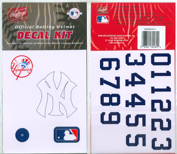 Chances are if you are viewing this item you are probably looking for decals for either your New York Yankees authentic batting helmet or your child's helmet for his little league baseball team. Either way this Rawlings decal kit is for you! It comes with 1 MLB logo decal, 1 New York Yankees team logo decal and a set of numbers. Easy to apply you can easily transform your collectible helmet into your favorite players helmet or transform you child's helmet into what you need for his team. Need a different team than the New York Yankees? The Cove has you covered as we have them for all MLB teams!